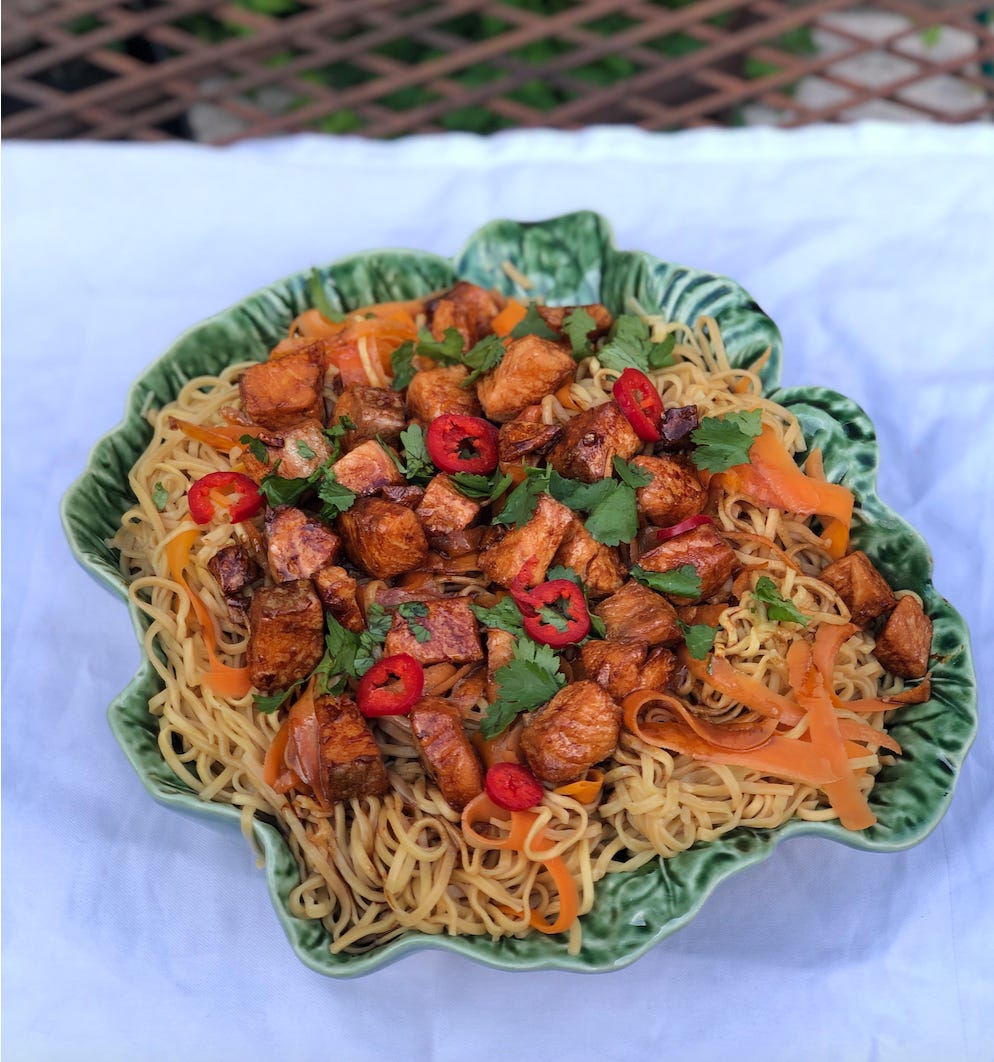Ginger and garlic sautéed pak choi and carrot ribbons. All tossed through soft egg noodles and served with optional chillies and coriander.